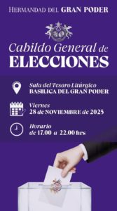 El próximo viernes, día 28 de noviembre, en horario de 17:00 horas a 22:00 horas tendrá lugar el CABILDO GENERAL DE ELECCIONES en la dependencia del Tesoro Litúrgico.