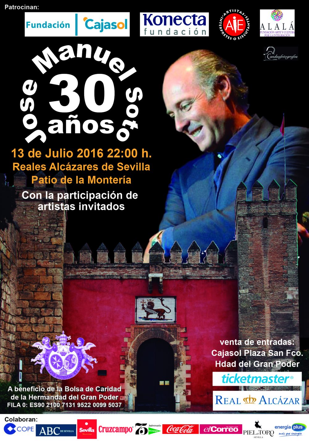 El próximo miércoles 13 de julio en el Patio de la Montería de los Reales Alcázares de Sevilla se celebrará un concierto del reconocido artista sevillano José Manuel Soto en el que conmemorará sus 30 años de dedicación a la canción. Para esta ocasión ha tenido a bien que lo recaudado por la venta de las entradas de ese concierto sea destinado a la Bolsa de Caridad de Nuestro Padre Jesús del Gran Poder, que desde hace 63 años se dedica a ser las manos del Señor con los más necesitados.