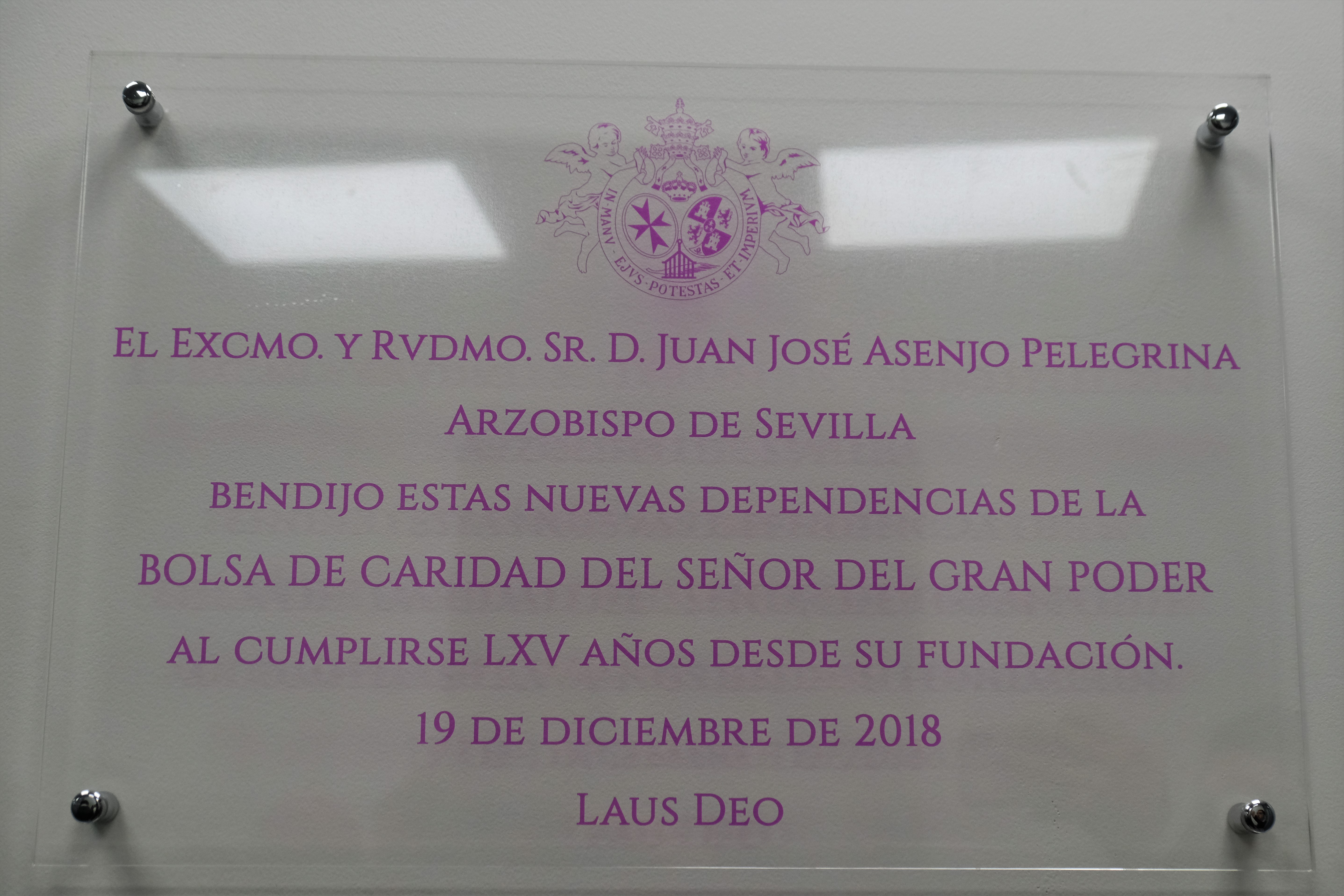 El pasado 19 de diciembre quedaron inauguradas las nuevas dependencias de la Bolsa de Caridad de Nuestro Padre Jesús del Gran Poder con su bendición por parte de S.E.R. el Arzobispo de Sevilla, D. Juan José Asenjo Pelegrina. En el acto, que contó con la intervención de nuestro Hermano Mayor, D. José F. Ríos Villegas y con el rito de la bendición por el Arzobispo, también estuvieron presentes el Presidente del Consejo de Cofradías y los Hermanos Mayores de las hermandades de la feligresía, así como de una serie de patronos que, gracias a su donación, han posibilitado la finalización de estas obras, entre los que destacamos a la Fundación Persán, la Fundación Cajasol, la Obra Social “la Caixa” y la Fundación Caja Rural.