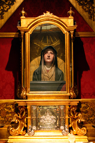 En el testero de la Capilla del Sagrario, la Dolorosa aparece en un retablo vitrina de madera dorada. Apoyado sobre un banco conformado por la adaptación del sagrario de plata, el retablo vitrina, transparente en sus tres de sus frentes, aparece cerrado por vidrios, mientras que el testero del fondo presenta elementos estofados en bajo relieve.