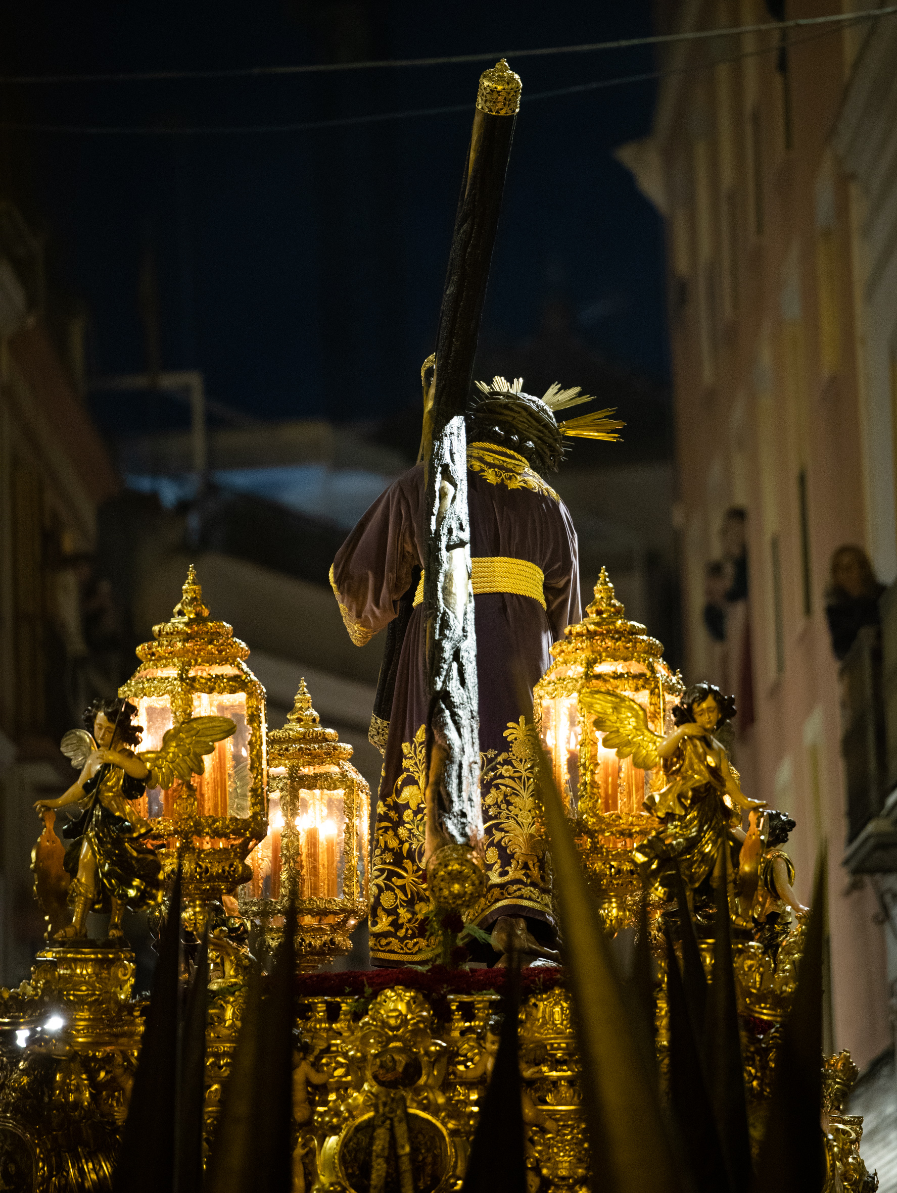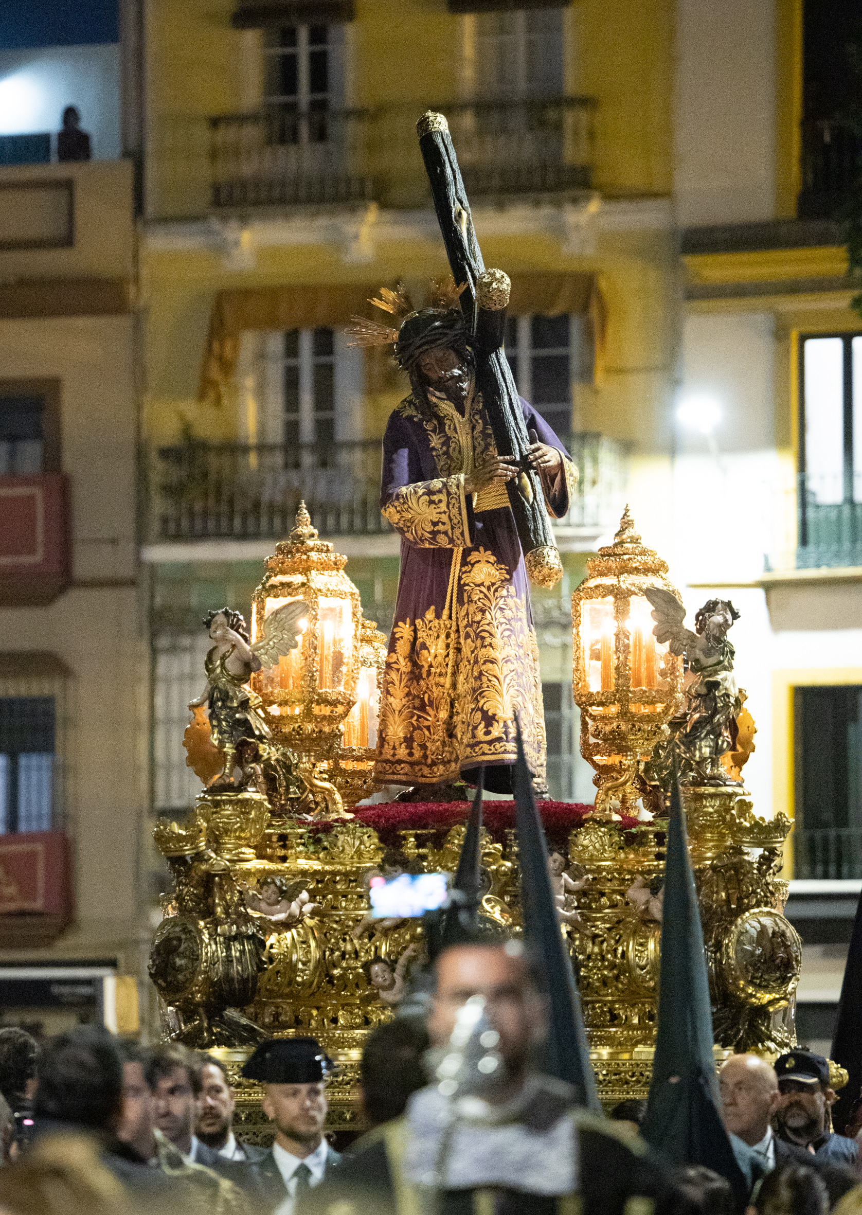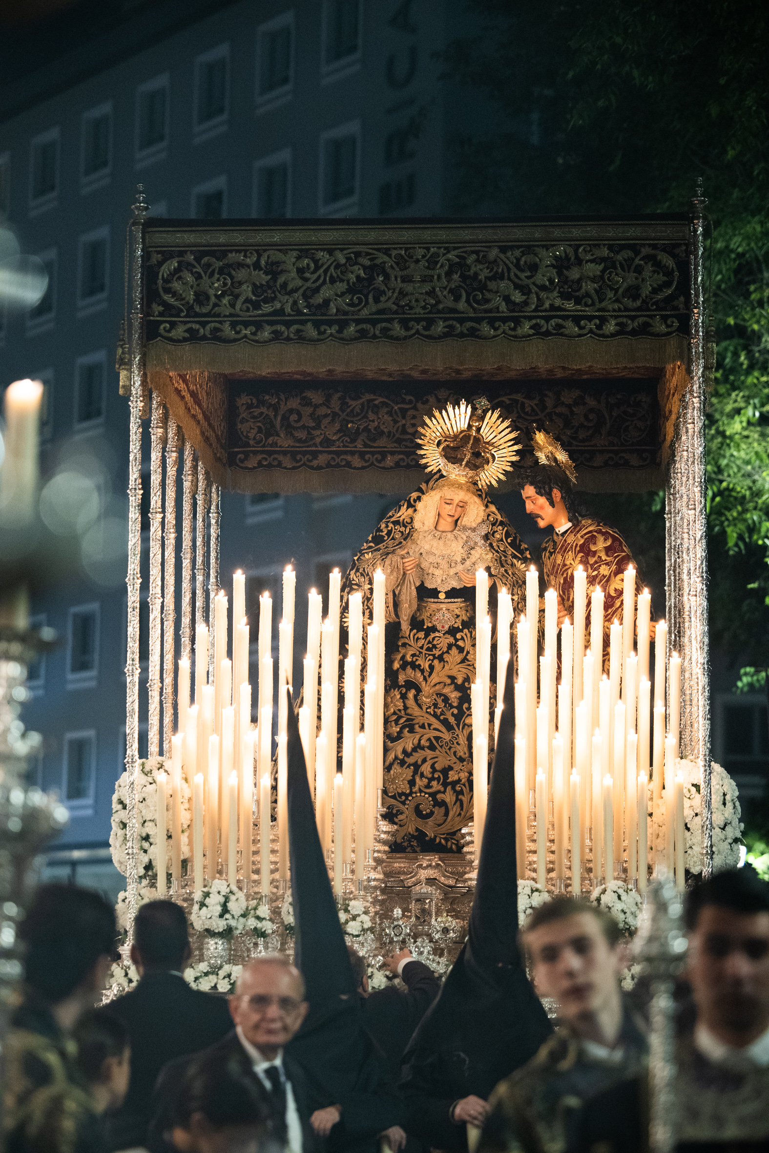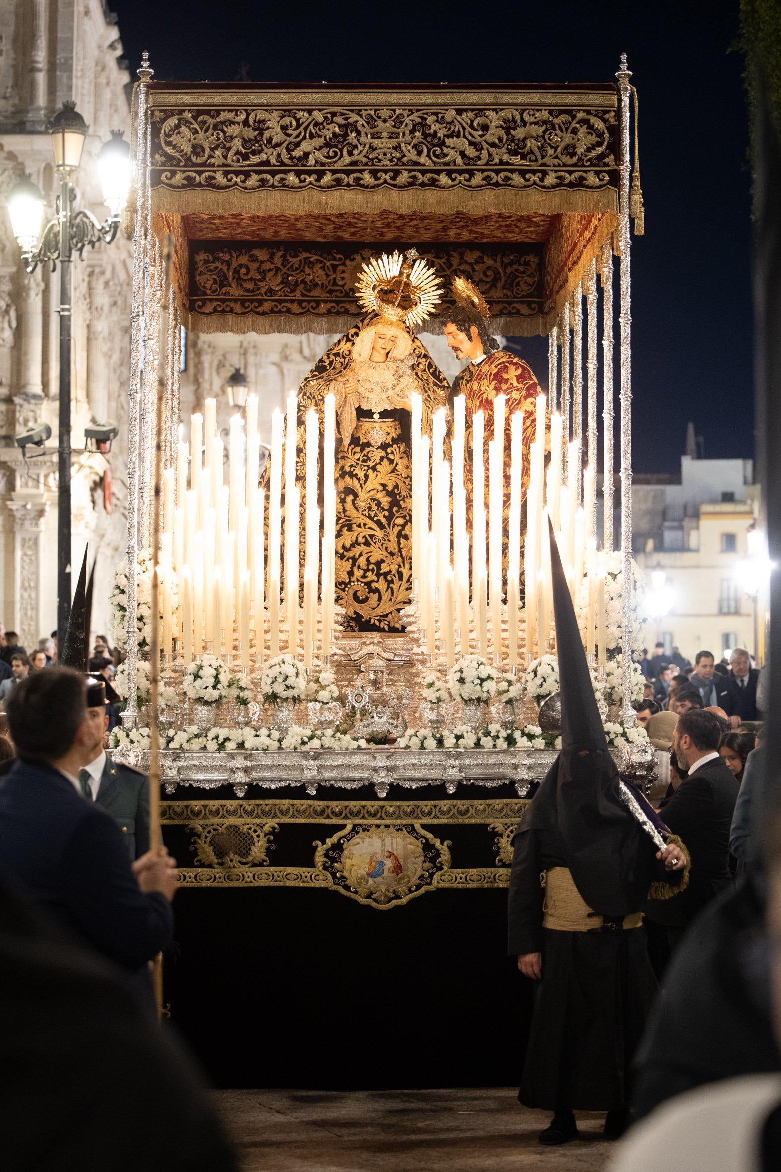 El Señor aguardaba en su paso, como lo hiciera en la Madrugada de 1817, año en el que estrenó la túnica de las Flores, obra de Francisca de Paula Zuloaga. Desaparecida esta túnica, un grupo de hermanos y devotos de los Viernes del Señor quiso ofrecerle una túnica bordada. Se inició así un proceso de reconstrucción, primero del dibujo y después del bordado de la pieza, labores que corrieron a cargo de Francisco Javier Sánchez de los Reyes y del Taller de Bordados Santa Bárbara. Y así nació la túnica de los Devotos, que testimoniaba la devoción durante cuatro siglos al Señor; con ella procesionaría por primera vez en la noche de este Viernes Santo. La Santísima Virgen lo hacía en esta ocasión con el manto azul que realizaron los talleres de Fernández y Enríquez en 1991.