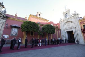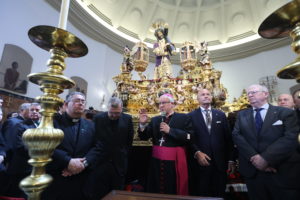 A lo largo de la mañana, recibimos la visita del Excmo. y Rvdmo. Sr. Arzobispo, D. José Ángel Saiz Meneses, acompañado por el presidente del Consejo General de Hermandades y Cofradías de la ciudad, D. Francisco Vélez, y miembros de la Junta Superior. El Sr. Arzobispo nos dirigió unas afectuosas palabras previas a la estación de penitencia, en las que nos exhortó a hablarle al Señor de corazón a corazón y a pedir su gracia para afrontar y superar los momentos de dificultad.