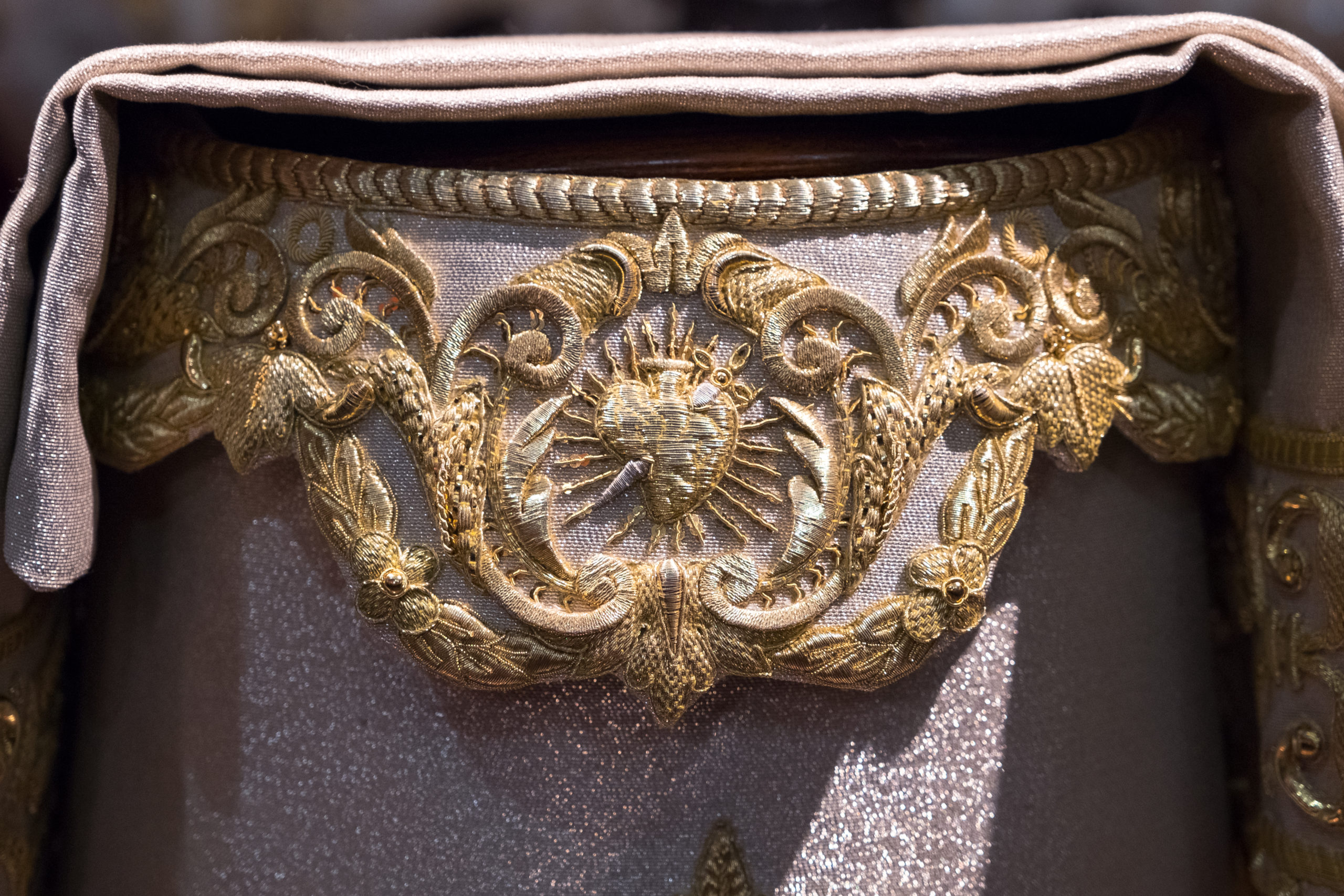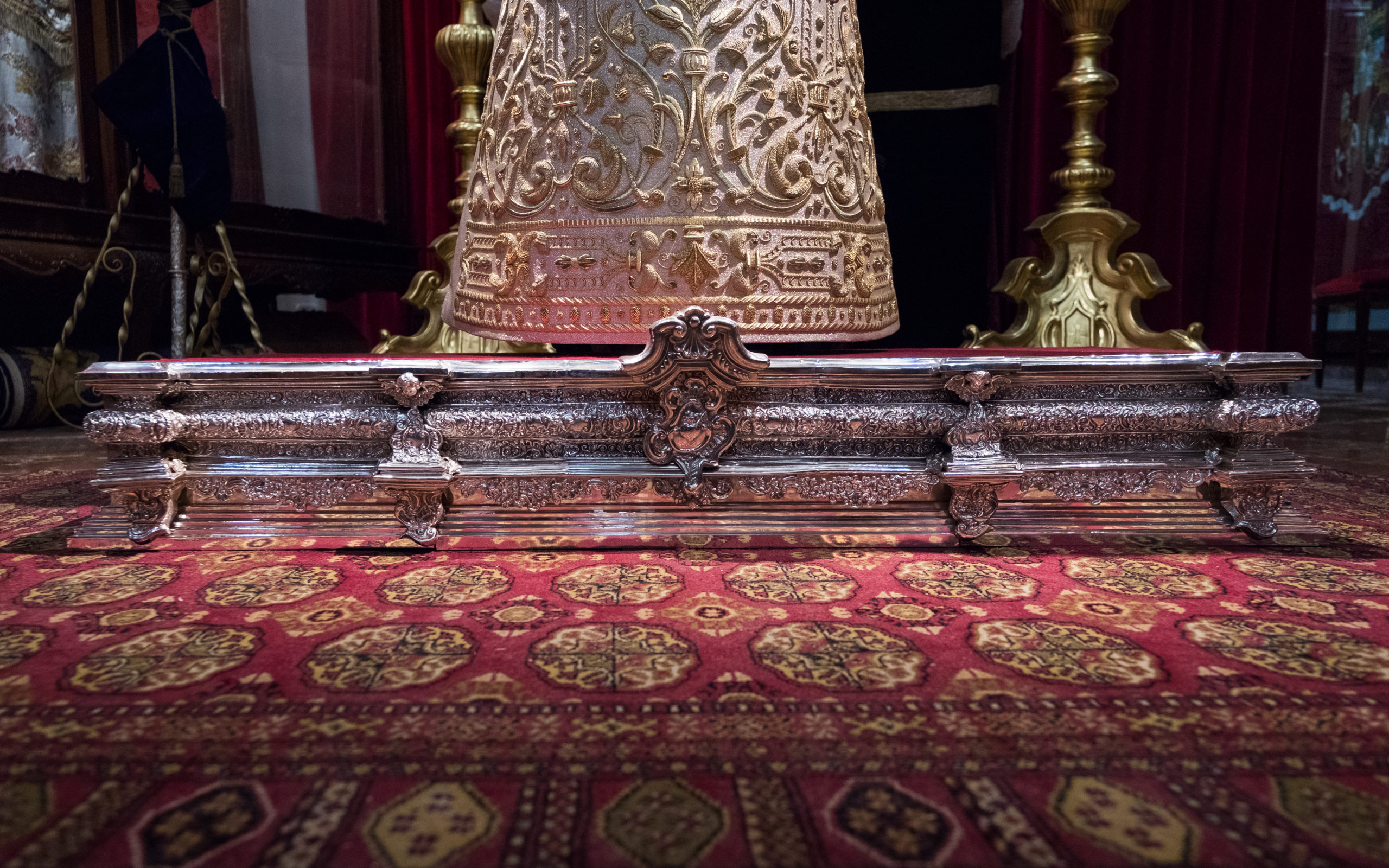 La saya, realizada en tisú de plata, se ha confeccionado aprovechando una estola donada a la Hermandad ex profeso obra del Taller de Caro de los años 90. En su presentación se ha ubicado sobre la peana de plata estrenada recientemente y creada partiendo de los moldurones traseros del paso de palio, la cual fue encargada al taller de los Hermanos Marmolejo.