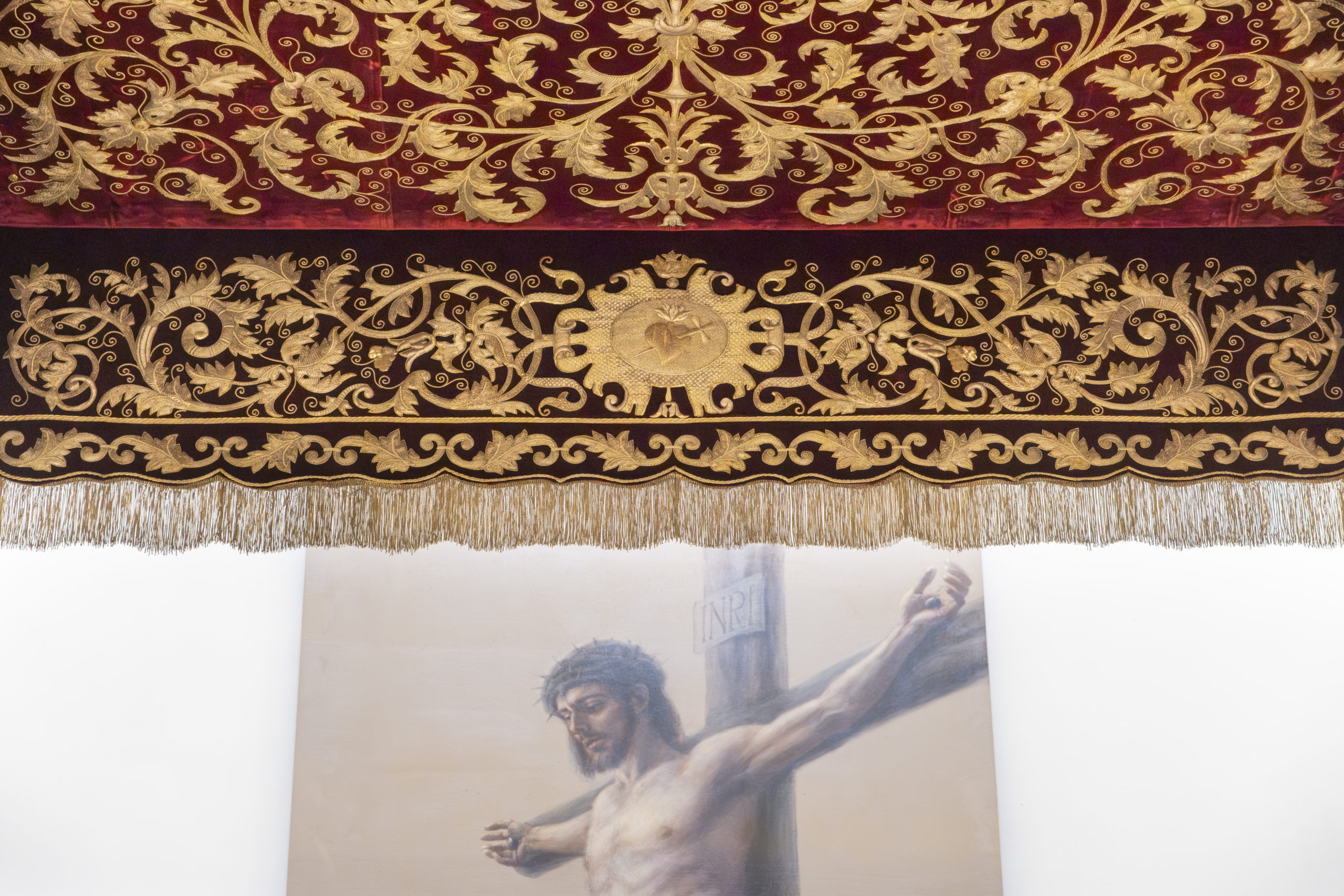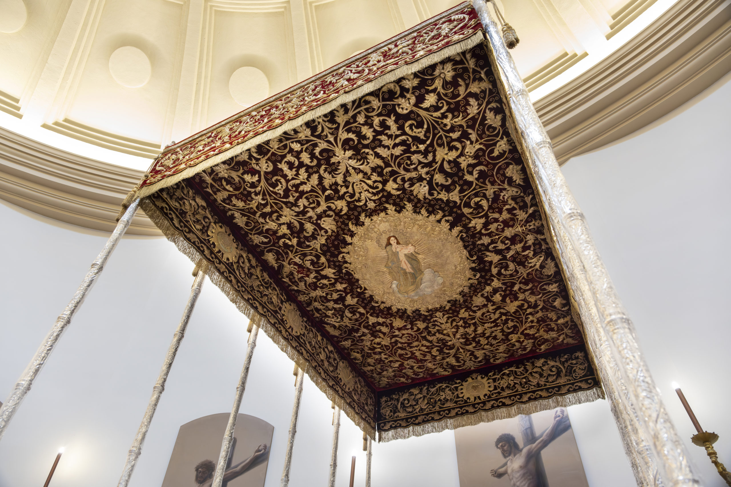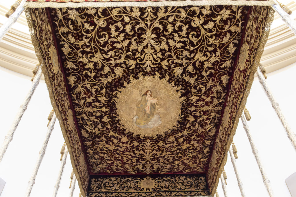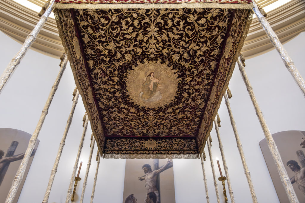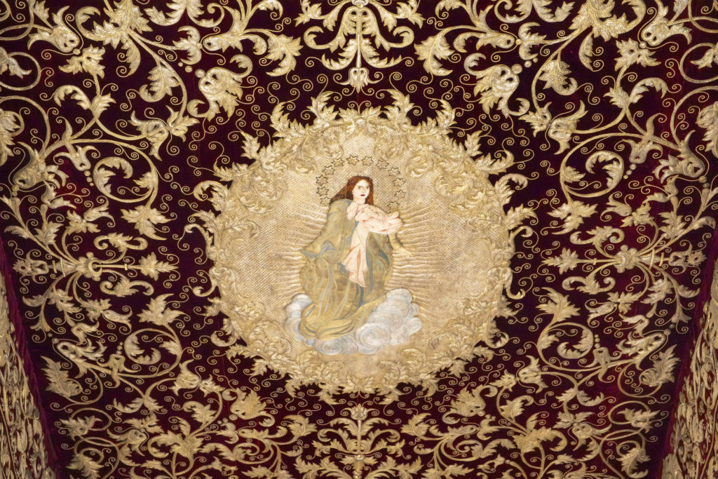 El techo y las bambalinas del paso de palio de la Santísima Virgen del Mayor Dolor y Traspaso, obra realizada en 1903 por el bordador Juan Manuel Rodríguez Ojeda, han sido sometidos a labores de conservación y mantenimiento en el taller de Jesús Rosado.